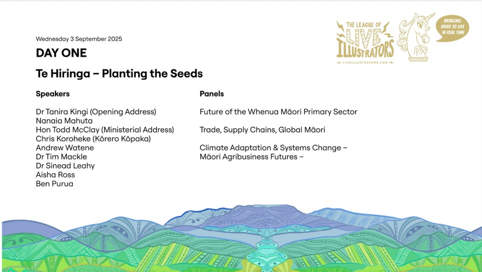This pages gather the live illustrations from the 2 days of the Te Arawa Arataua Māori Agribusiness Summit, 3-4 September 2025.